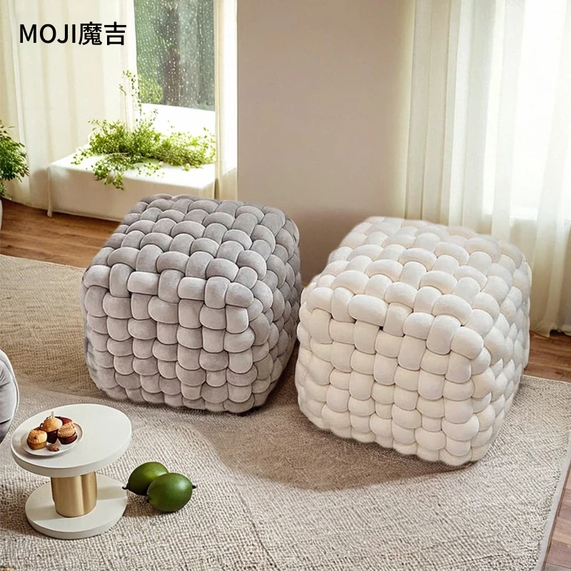 MOJI魔吉オリジナルデザイナー手作り編み込みキューブスツール - おしゃれなクリーム風デザインの座椅子、靴を履く時や化粧時にぴったりな快適なフットスツール!