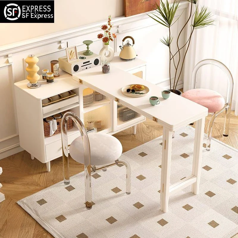 【香港送料無料】折りたたみクリームカラーのダイニングテーブル&サイドキャビネット一体型!小型住宅に最適、伸縮可能でバー台としても使える多機能デザイン!